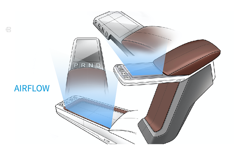 To ensure even safer use of our hand gesture controller, I incorporated an airflow around the center console to better indicate the hand gesture camera's sweet spot. The airflow started and stopped the moment the camera recognized a hand and its movement. This allowed the driver to position their hand within the camera's detection zone without looking, as the airflow was strong enough to be felt when the hand was optimally placed. This innovative combination of technologies enhanced both user experience and safety.