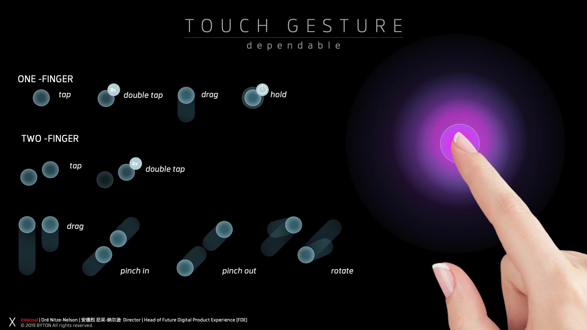 - Trackpad Mode to conveniently interact with content on our Byton Stage. This mental model is based on remote control or PC trackpad interactions where the user doesn’t have to look at it. With no content displayed on the Driver Display, we can keep the driver’s eyes on the road.